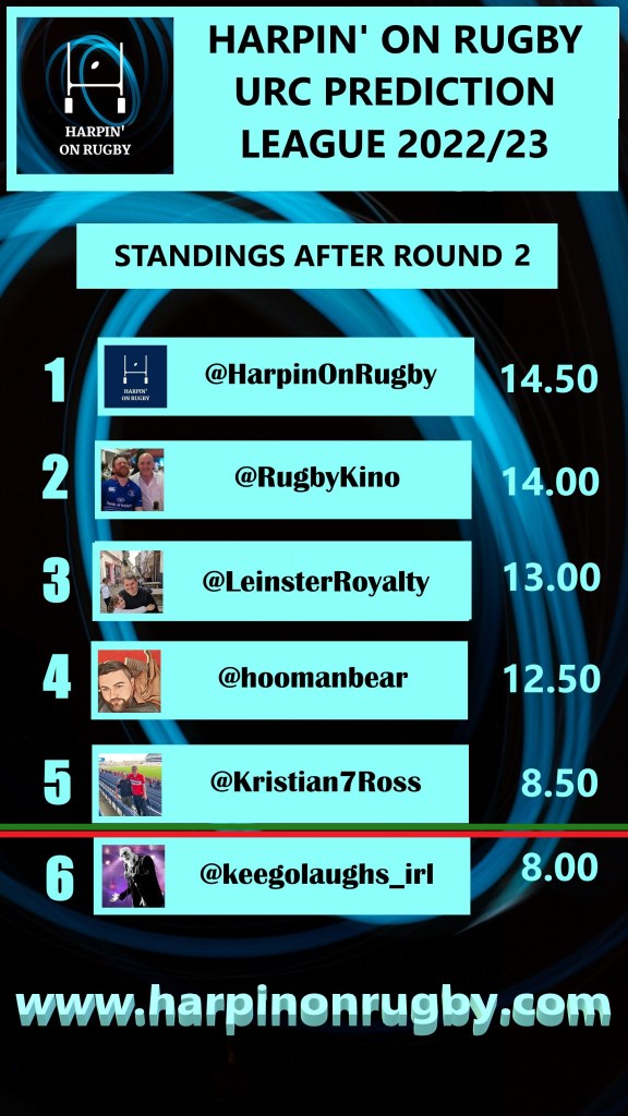 Two weeks into the season and though I am yet to win a round, I actually top the league for now. Those pesky Ospreys let in a late score for the second week in a row to cost me some points, and I would have made some decent ground had they not done so. The only other match I got wrong was Dragons v Munster but in that case, nobody saw that coming.