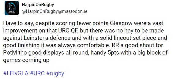 RichardMifsud Dominant display by #LeinsterRugby against Glasgow Warriors Great to see returns from key players after injury Poor discipline and inaccuracies will keep the coaches busy but overall a very welcome return to #URC action for the boys