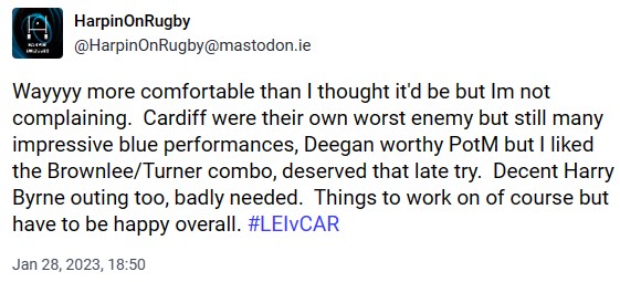RichardMifsud I always love watching @leinsterrugby play but I particularly love it when the young guns get a run out. TBH I was expecting a tougher game but Cardiff disappointed Deegs very worthy POTM Good outings from Milne Brownlee Turner as well as our starting back row and halfbacks Disappointing 10 minutes in the final quarter but that’s great learning for the kids