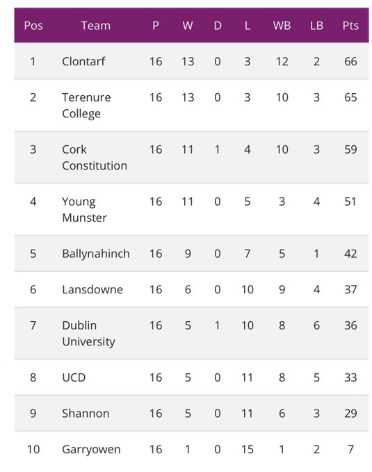 With all of the top four at home in round 16 of Division 1A it was kind of inevitable that all would cement their places and the gap of 9 points to fifth place will be tough to close. It’s looking very much like we’re going to have two Leinster v Munster semifinals to look forward to.