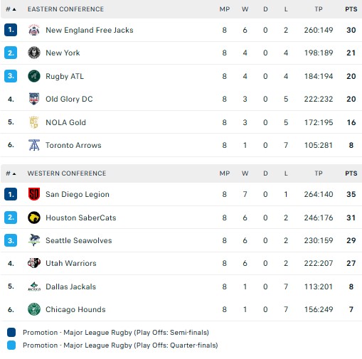 So as you can see by the tables below it’s the Free Jacks and Legion leading the way in the conferences at the halfwy stage