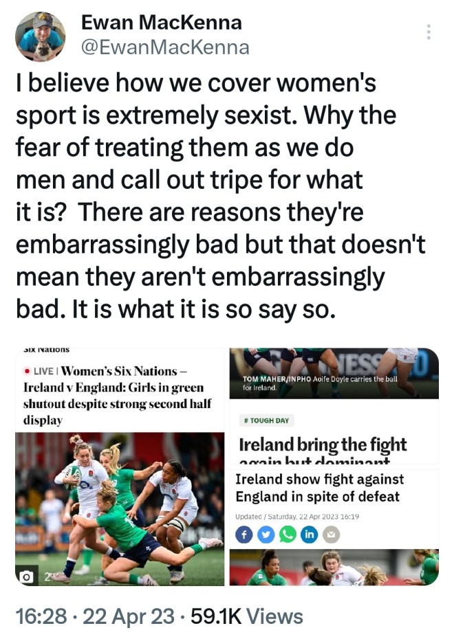 This weekend however I wonder if he tripped himself up with his own fabricated narratives. I think in his mind he’s on a safe footing having a pop both at rugby as a whole, and at Dublin GAA in particular, as both will get him attention among similar groups of rage-tweeters.