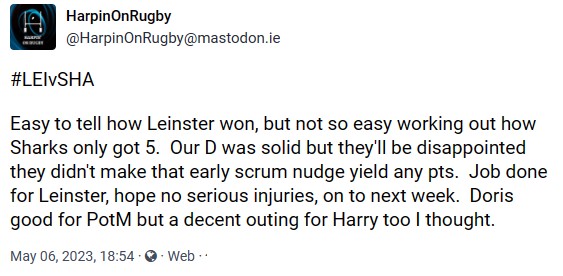 Time to rethink the quarterfinals stage? That wasn’t a proper match, Sharks seemed to turn up with a one dimensional game plan, only wishing to front up at the scrum and then return home as quickly as possible. No fight in them to have a shot at Leinster with a proper game plan. Knockout rugby gives you a chance to take down the top teams, Sharks just didn’t look interested in anything other than taking scrums.