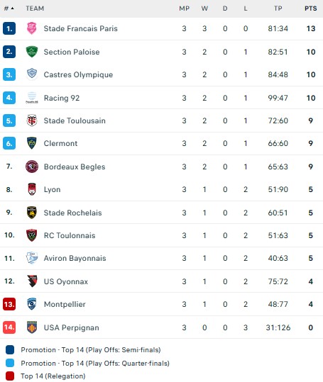 With the league’s penchant for teams skimping on away selections, it’s actually not that often that teams win or lose all of their opening three matches, and this year is no exception with only Stade Francais at the top and USAP at the bottom being perfect in their own way.