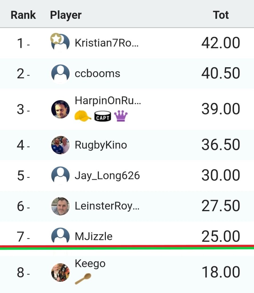 Although I’m still in third place I gained some ground by pinching the yellow cap this week for the highest score, mostly due to my somehow managing to predict Zebre’s historic win over the Sharks. I don’t know what came over me when I made the call, except for the fact that the Parma outfit had been doing well picking up bonus points so far this season while the Sharks were at the end of a long road trip so it was probably worth the punt.