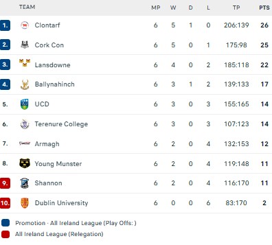Recent Leinster debutant Dylan Donnellan marked his return to the AIL with two tries but leaders Clontarf could only manage a draw away to Hinch although they still remain top. Cork Con’s demolition of lowly Trinity brought them to within a point of 1st while champions Terenure continue to struggle to stay in touch with the top 4 as they fell away to Young Munster.