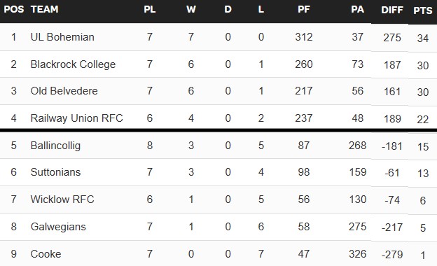 Round 8 of the Women’s AIL has once again highlighted the gap between the top 4 clubs and the rest, with the two matches involving sides from both ends of the table being blow outs and the two more evenly matched contests being close. UL Bohs held out Belvo to keep their 100% record intact, but their schedule doesn’t get any easier as they must travel to Belvo the weekend after next while another potential semifinal matchup between Rock and Railway takes place at the same time, and when those matches are complete the league will be at its halfway point.