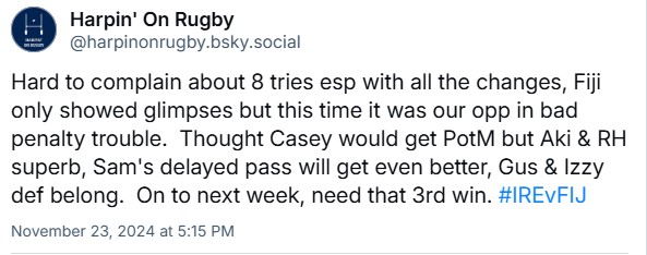 Bearing in mind that Fiji were poor, I think we can still take away positives. Great first time starts from Sam and Gus. And many of the veterns put in strong performances – Aki, Henshaw, Doris, VdF. I was also really impressed with Casey.