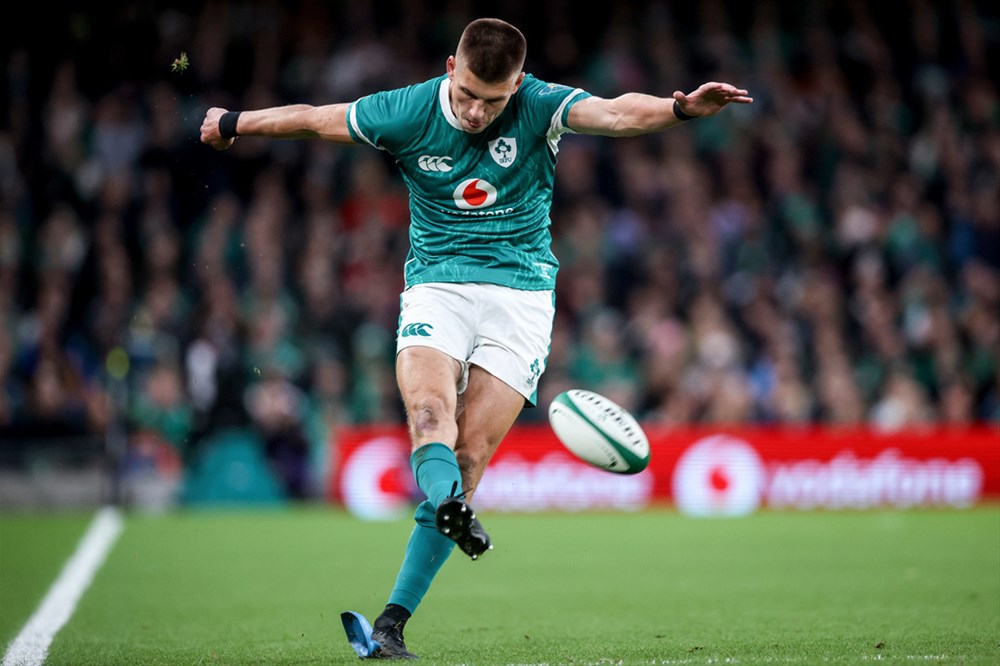 Ireland’s Sam Prendergast takes a kick Mandatory Credit