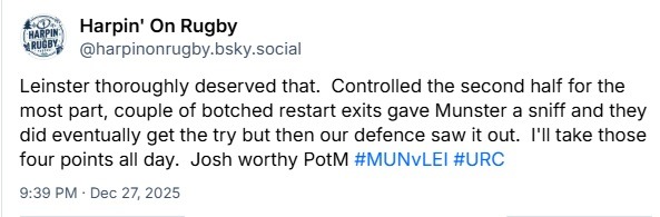 Close game, Munster pushed hard & Leinster defence improving. Harry best 10 we have.