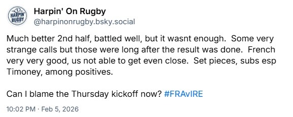 Fixed the perceived problems, scrum solid, gave away 3 penalties in the entire game, only one preventable, line out held up against French going after it. Sam Prendergast’s tackling was arguably the best of the Irish backs. Then they kicked and kicked and kicked when it was clear the French has superior aerial skills. 22-0 at half time and 29-0 down at nearly an hour and it looked like a hiding. Then they woke up and were unlucky the ref didn’t card Dupont when 29-14, they could with a man advantage have got a lot closer. Next game out through Edogbo in at 5, Furlong will be back, put Beirne in at 6 and hopefully the 3 larger ball carriers will get us more yards when we have the ball. France deservedly on their way to retaining their championship