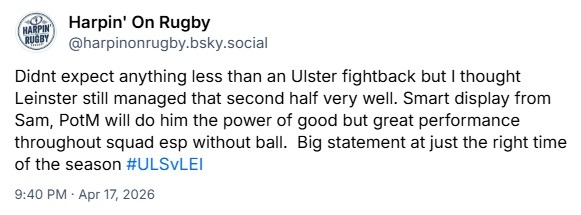 Thought Sam looked good there – played with confidence. And Ulster were smothered in the first half by the Leinster defensive line so couldn’t get anything going – well played Leinster (from an Ulsterman) #SUFTUM