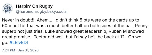 Well done. Great resilience against a team who lose rarely at home. Great vision from Sam to follow the ball for his try.