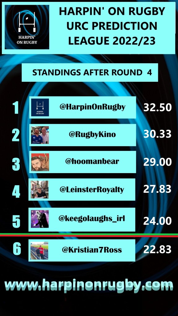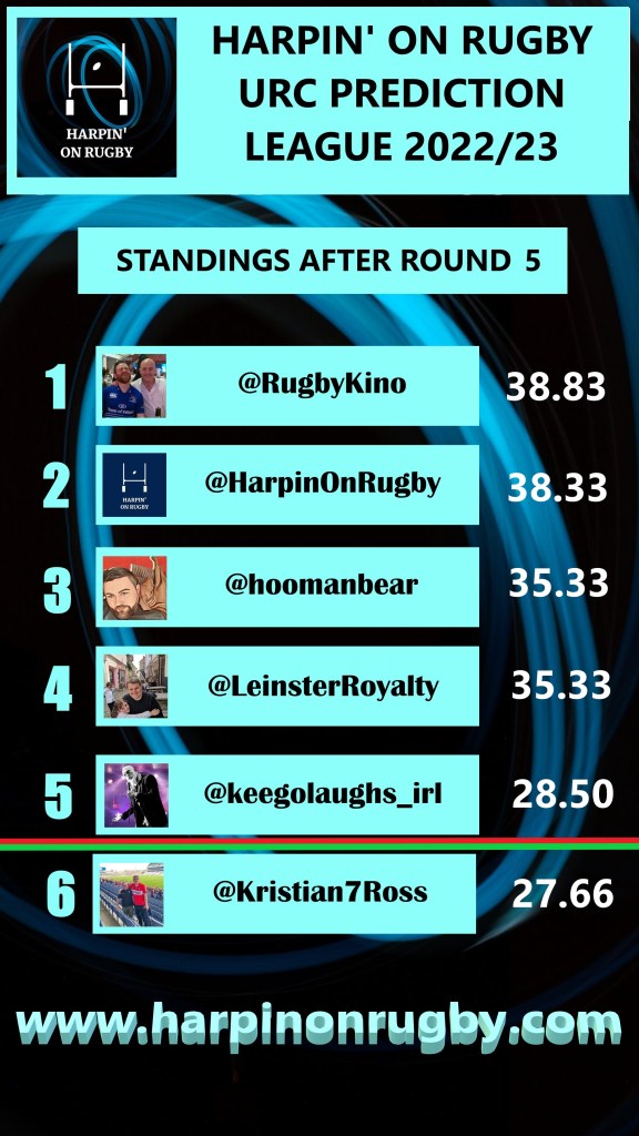 The return of the URC also means the return of the Harpin’ Prediction League and the good news for me this week is that I made up a lot of ground on Kino who was getting a little too comfortable at the top. However the bad news for me was that I’d be an extra point closer if only I had remembered to get my prediction for Stormers and Scarlets in on time!!! Still though, at least the Ospreys came through for me this weekend, while the URC’s 2 upset results, namely Benetton beating Embra and Cardiff’s shock whitewash of the Sharks, not being forecast by any of us. Down at the bottom of the table as you can see, it’s not looking good for Keego who may have to don The Jersey Of Shame at season’s end.