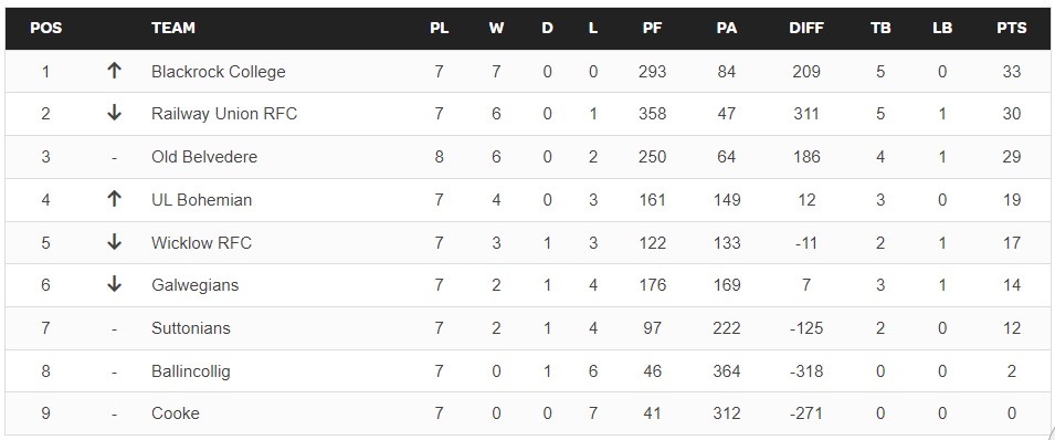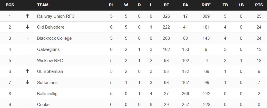 Meanwhile in the men’s version they are at round 7 of 18 with Terenure continuing their perfectly perfect start with 35 points out of 35 although Clontarf did stay close enough to them in the round’s biggest clash for a losing bonus. The Nure have another 1st v 2nd clash in the next round when they host Trinity at Lakelands.