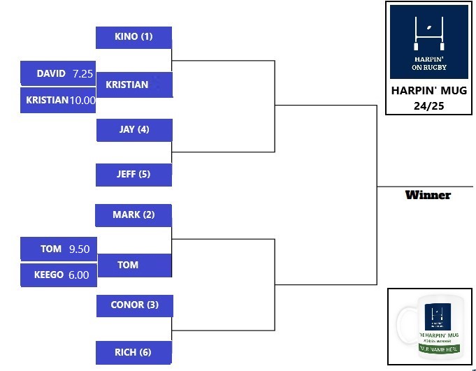 As you can see our resident stats expert Rugby Kino is leading the way but we’re only passing the halfway stage, and we’ve also added a Cup (or Mug) competition to make things interesting. Myself and Conor have already reached the semifinals, in the third quarterfinal Kino leads Kristian but just half a point with one more match still to forecast