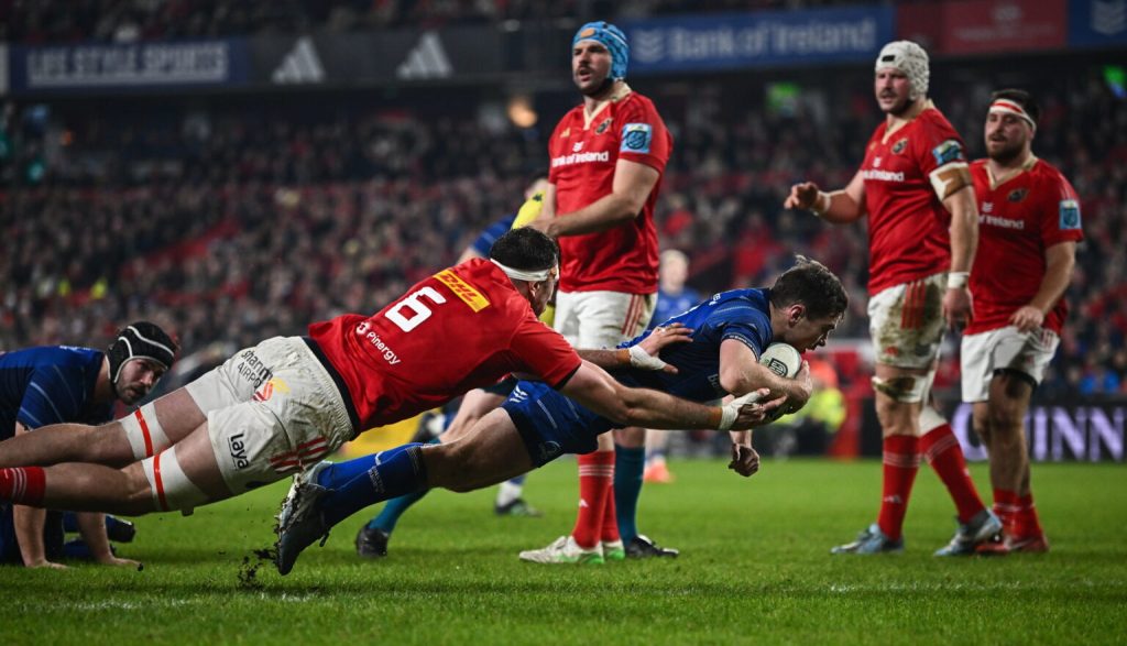 27 December 2024; Luke McGrath of Leinster scores his side’s first try during the United Rugby Championship match between Munster and Leinster at Thomond Park in Limerick. Photo by Seb Daly/Sportsfile