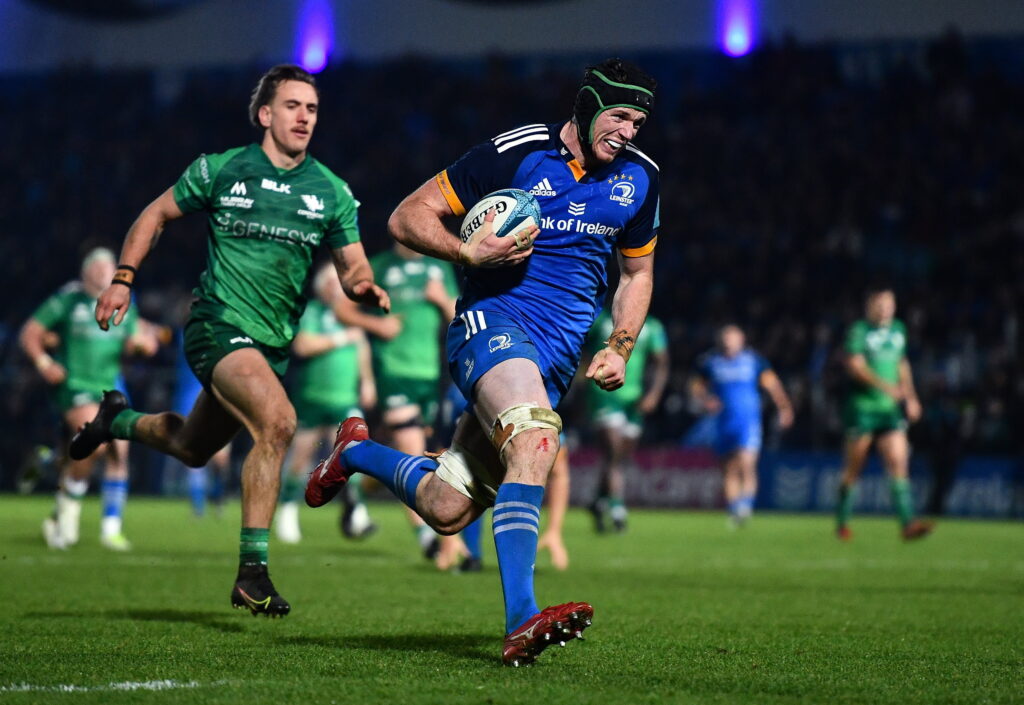 1 January 2023; Ryan Baird of Leinster on his way to scoring his side’s sixth try during the United Rugby Championship between Leinster and Connacht at RDS Arena in Dublin. Photo by Ben McShane/Sportsfile