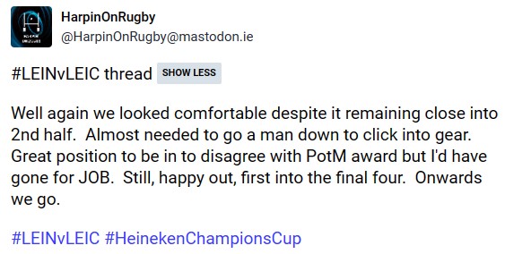 On the Harpin podcast during the week I’ll be chatting to a Leinster fan who travelled to Welford Road about the whole experience and then our attention, naturally will turn to our semifinal date with Toulouse next Saturday at 3pm. Stay tuned to this page as well as any or all of our social media channels to catch our usual features like previews and such. Thanks as ever for sticking with the writeup to the end. JLP