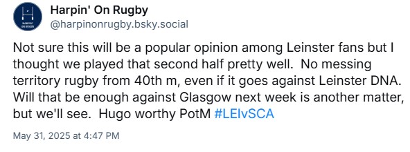Brilliant team performance! So happy for everybody at Leinster rugby. I hope they all thoroughly enjoy celebrating this and that it can be the foundation that next season is built upon.