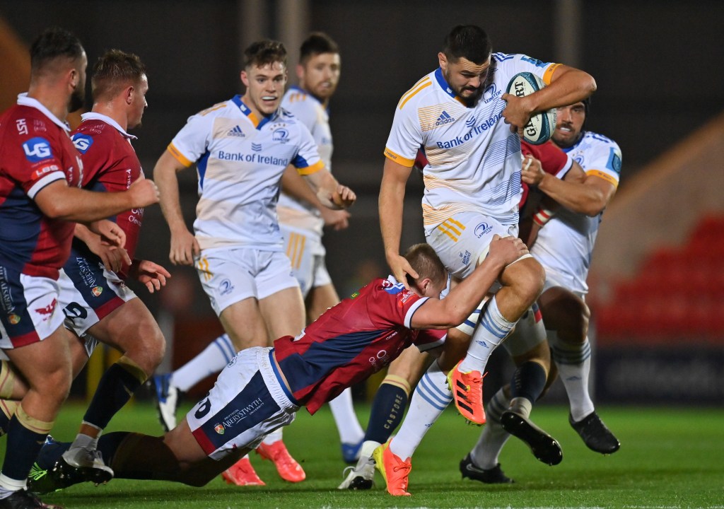 28 October 2022; Max Deegan of Leinster is tackled by Dan Thomas of Scarlets during the United Rugby Championship match between Scarlets and Leinster at Parc Y Scarlets in Llanelli, Wales. Photo by Harry Murphy/Sportsfile