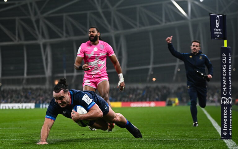 13 January 2024; James Lowe of Leinster dives over to score his side’s first try during the Investec Champions Cup Pool 4 Round 3 match between Leinster and Stade Francais at the Aviva Stadium in Dublin. Photo by Harry Murphy/Sportsfile