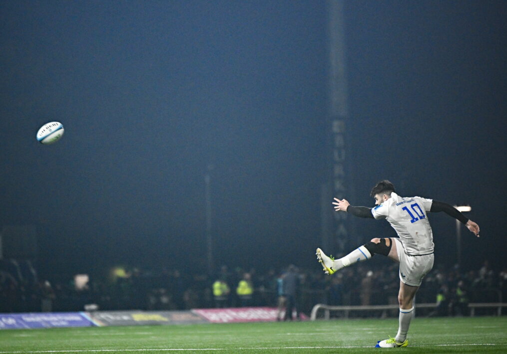 2 December 2023; Harry Byrne of Leinster kicks a conversion during the United Rugby Championship match between Connacht and Leinster at the Sportsground in Galway. Photo by Harry Murphy/Sportsfile